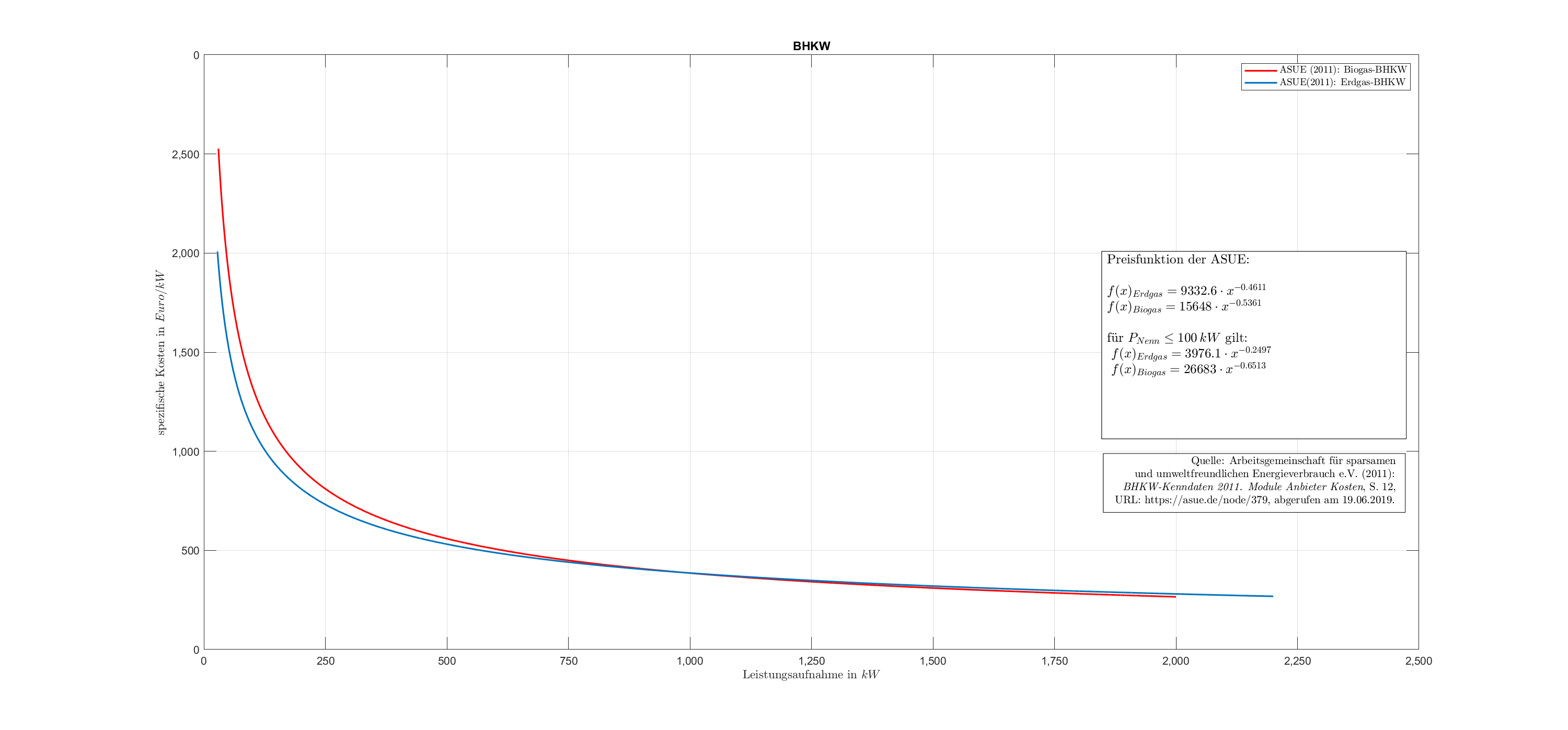 Bsp. Modulkosten Flüssiggas-BHKW mit Pel von 150 kW: 5.242,4*x^-0,359 = 867,59 €/kW Modulkosten: 867,59 €/kW * 150 kW = 130139 € |